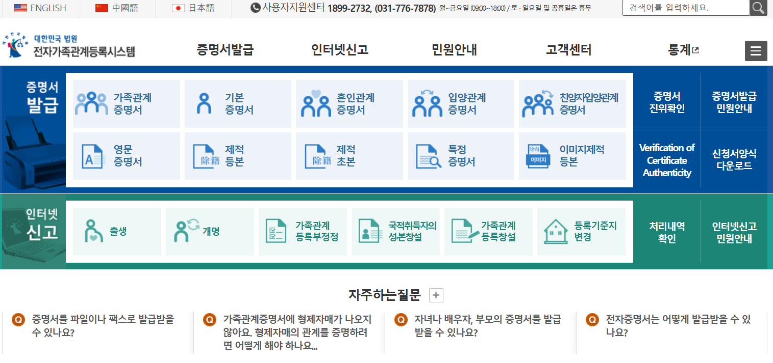인터넷으로 가족관계증명서를 발급받기 위해서는 대한민국법원 전자 가족관계 등록 시스템 이용하면 됩니다.