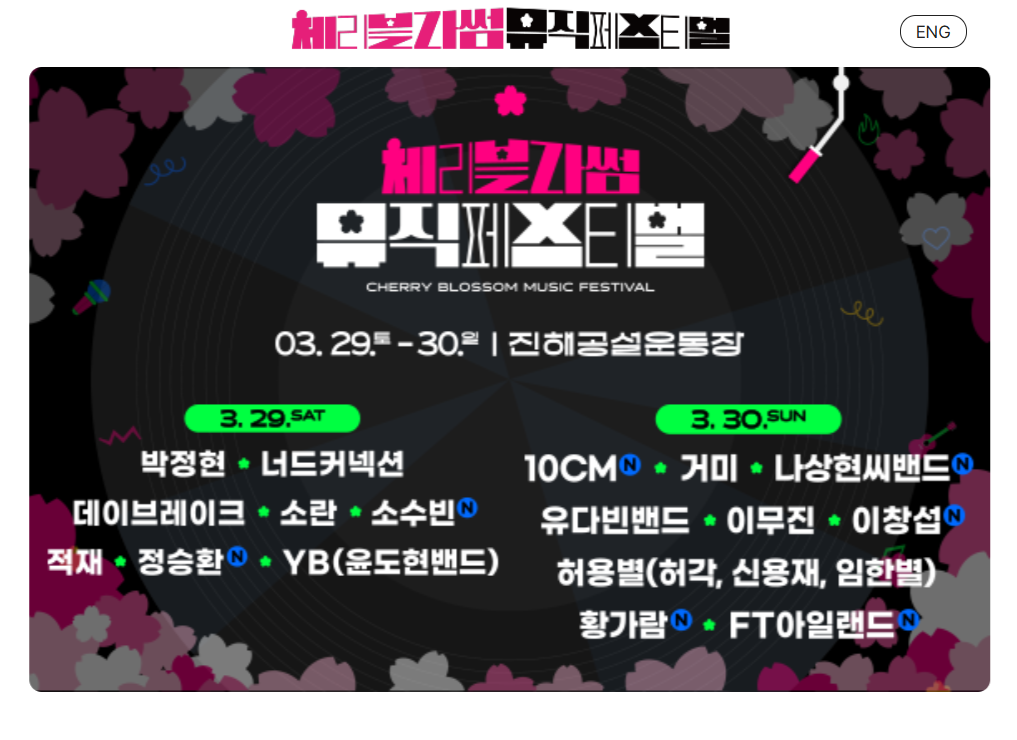 벚꽃 명소로 손꼽히는 진해에서 펼쳐지는 이번 페스티벌은, 단순한 음악 공연을 넘어 자연과 예술이 조화를 이루는 특별한 경험을 제공합니다. 올해 벚꽃놀이를 계획하고 있다면, 체리블라썸뮤직페스티벌에서 낭만적인 봄날을 즐겨보는 건 어떨까요?